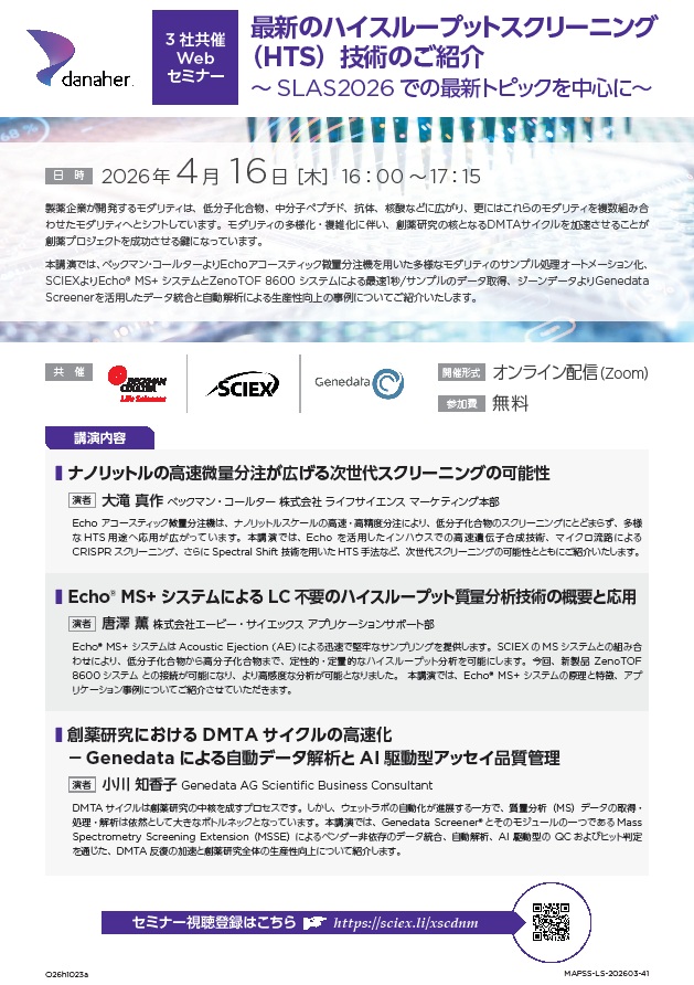 【企業セミナー】 SCIEX Webinar 最新のハイスループットスクリーニング(HTS)技術のご紹介(4月16日(木)16:00~17:15)